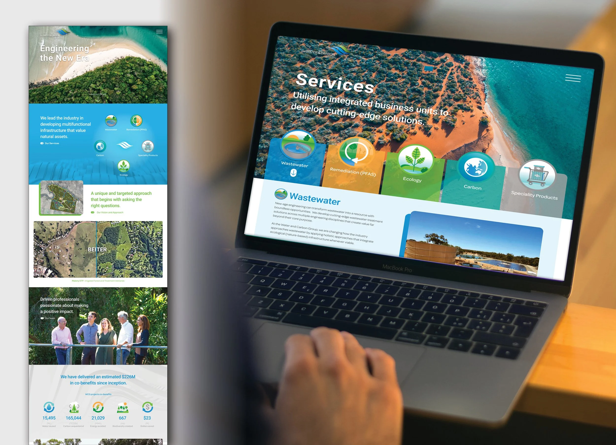An environmetally friendly water engineering technology company, required digital and print solutions covering logo design, outdoor and engaging website creation. Breathing life and vibrancy into the original monotone engineering feel of the brand.